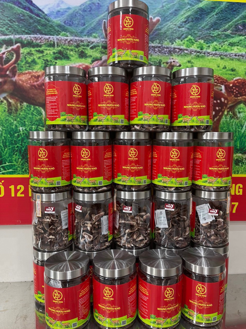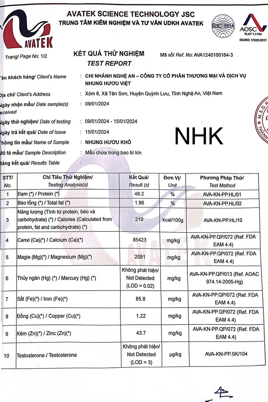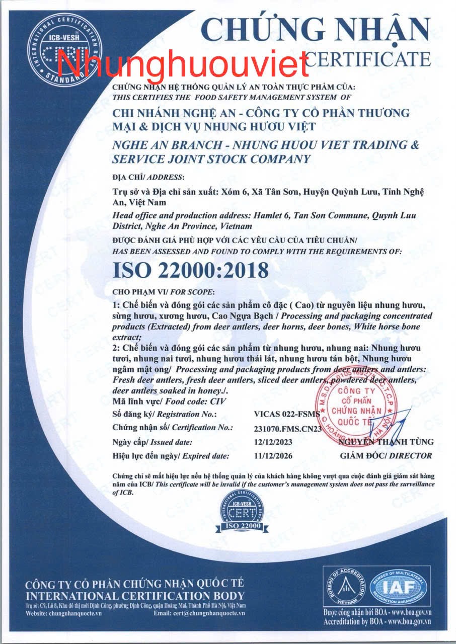 Nhung Hươu Khô của Nhung Hươu Việt được lựa chọn từ những cặp nhung đủ tuổi, Đúng kích thước sau đó rửa sạch để loại bỏ tạp chất và được đưa vào máy cắt lát xong cho vào máy sấy khô và tán thành bột, đảm bảo tiêu chẩn vệ sinh an toàn thực phẩm, đạt chứng chỉ ISO 22000-2018, Giá trị đồng nhất trên mỗi sản phẩm. Bên cạnh đó, nhân công được đào tạo bài bản từng khâu sản xuất, sản phẩm cuối cùng được đóng gói, gián nhãn, và truy xuất nguồn gốc rõ ràng. Thêm vào đó Nhung Hươu Khô của Nhung Hươu Việt được khách hàng tin dùng và được mệnh danh là sản phẩm( vàng ) cho sức khoẻ bởi hàng lượng chất dinh dưỡng cao, hàm lượng protein dồi dào, giàu chất béo…Nhung Hươu Khô của Nhung Hươu Việt có thể dùng cho mọi đối tượng đặc biệt trẻ em còi xương biếng ăn suy dinh dưỡng, ngươi dà yếu, mới ốm dậy….